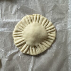 Jeweils einen zweiten Teigkreis auflegen und die Ränder gut andrücken. Rundherum mit einer Gabel fest eindrücken, damit die Taschen beim Backen geschlossen bleiben.