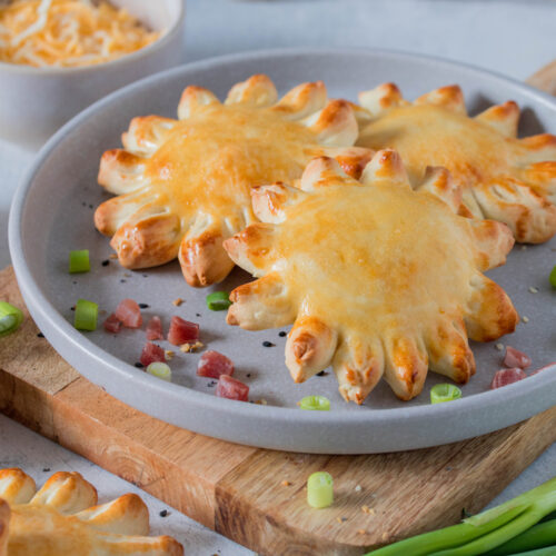 Die schöne (Sonnen-)Blumen-Form entsteht, wenn du Kreise ausstichst, diese rundherum mit einer Gabel eindrückst, dann einschneidest und die Enden zusammendrückst. Sieht optisch richtig toll aus und ist wirklich ganz easy- auch wenn es sich vielleicht auf den ersten Blick kompliziert anhört. In der Rezeptkarte weiter unten findest du alle genauen Zubereitungsschritte.