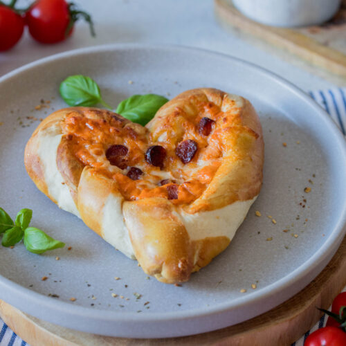 Dieses Laugenherz im Pizza-Style ist einfach, schnell gemacht und kommt immer gut an. Die Kombination aus weichem Laugengebäck, cremiger Füllung und herzhaftem Belag macht es besonders lecker. Außerdem kannst du es nach Lust und Laune abwandeln, sodass jeder seinen Lieblingsbelag bekommt.