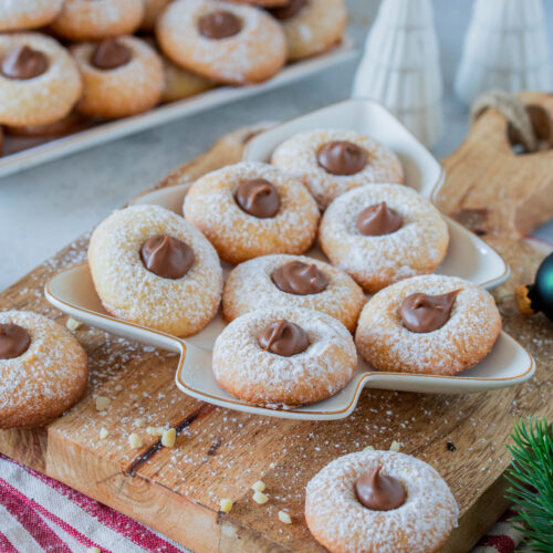 Diese Nuss-Nougat Plätzchen musst du unbedingt probieren. Sie werden aus einem unkomplizierten Teig zubereitet und lassen sich ganz easy formen und füllen. Der Teig wird zu kleinen Kugeln gerollt, leicht eingedrückt und nach dem Backen dann mit Nuss-Nougat gefüllt. Den Plätzchenteig kannst du auch schon am Vortag zubereiten und im Kühlschrank aufbewahren.
