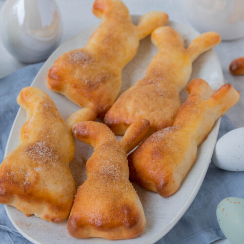 Direkt nach dem Backen die Hasen mit etwas flüssiger Butter bestreichen und anschließend mit Zimt und Zucker bestreuen.