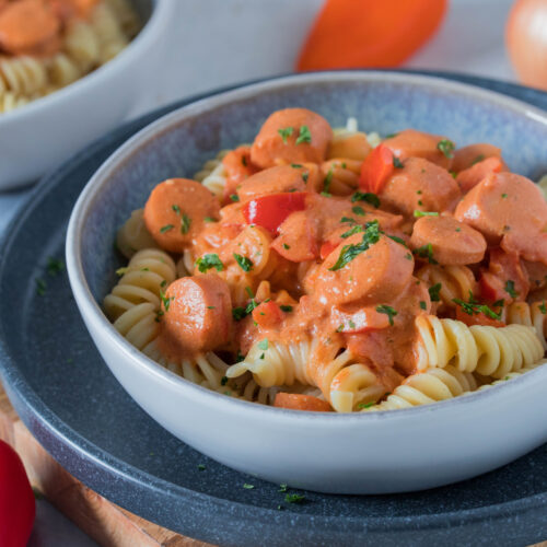 Bei den Beilagen bist du ebenfalls flexibel: Wir essen das Würstchengulasch am liebsten mit Nudeln, aber auch Reis, Kartoffeln oder frisches Brot passen sehr gut dazu.